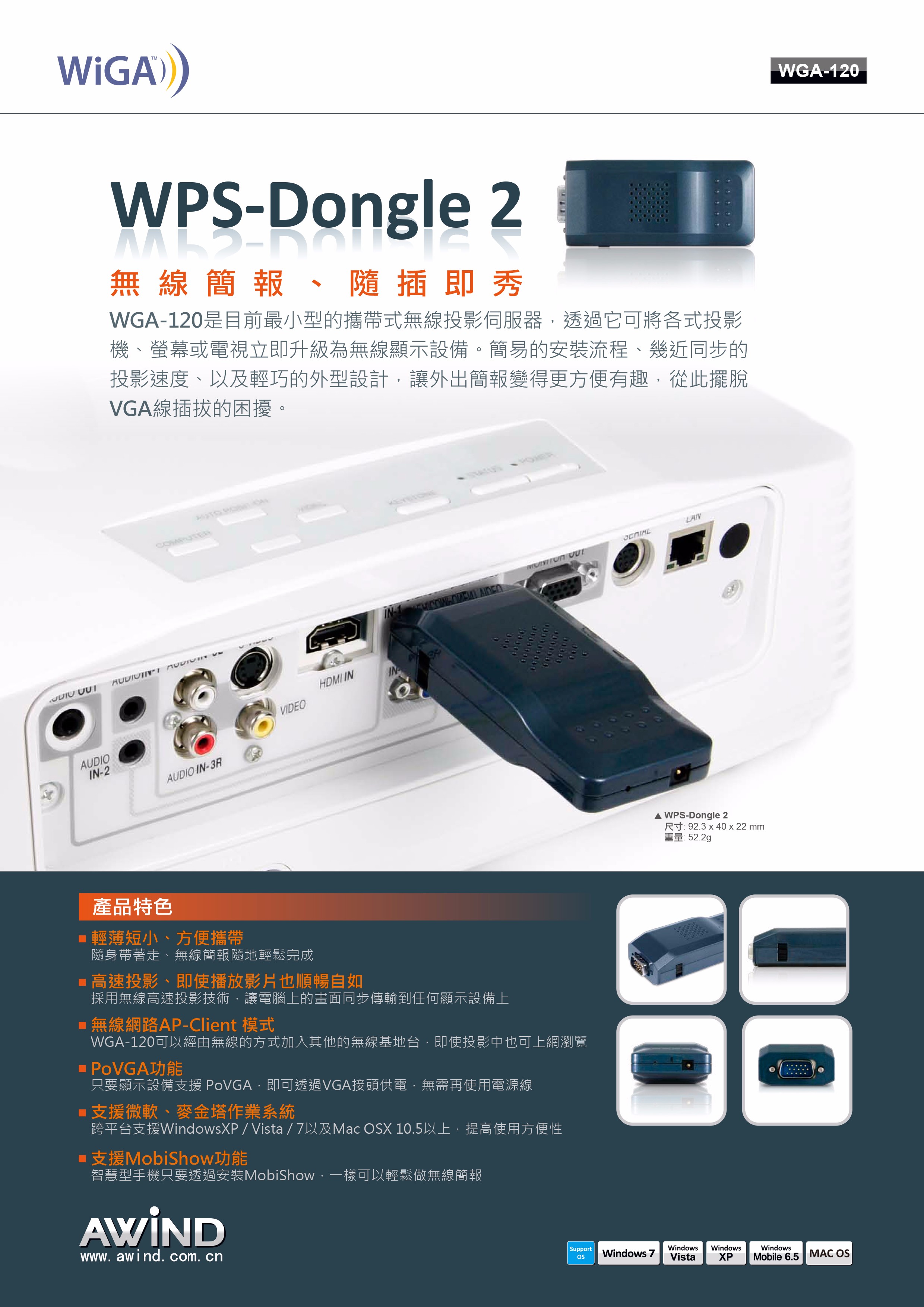 WGA-120 是目前最小型的攜帶式無線投影伺服器,透過它可將各式投影機、螢幕或電視立即升級為無線顯示設備。簡易的安裝流程、幾近同步的投影速度、以及輕巧的外型設計,讓外出簡報變得更方便有趣,從此擺脫VGA線插拔的困擾。