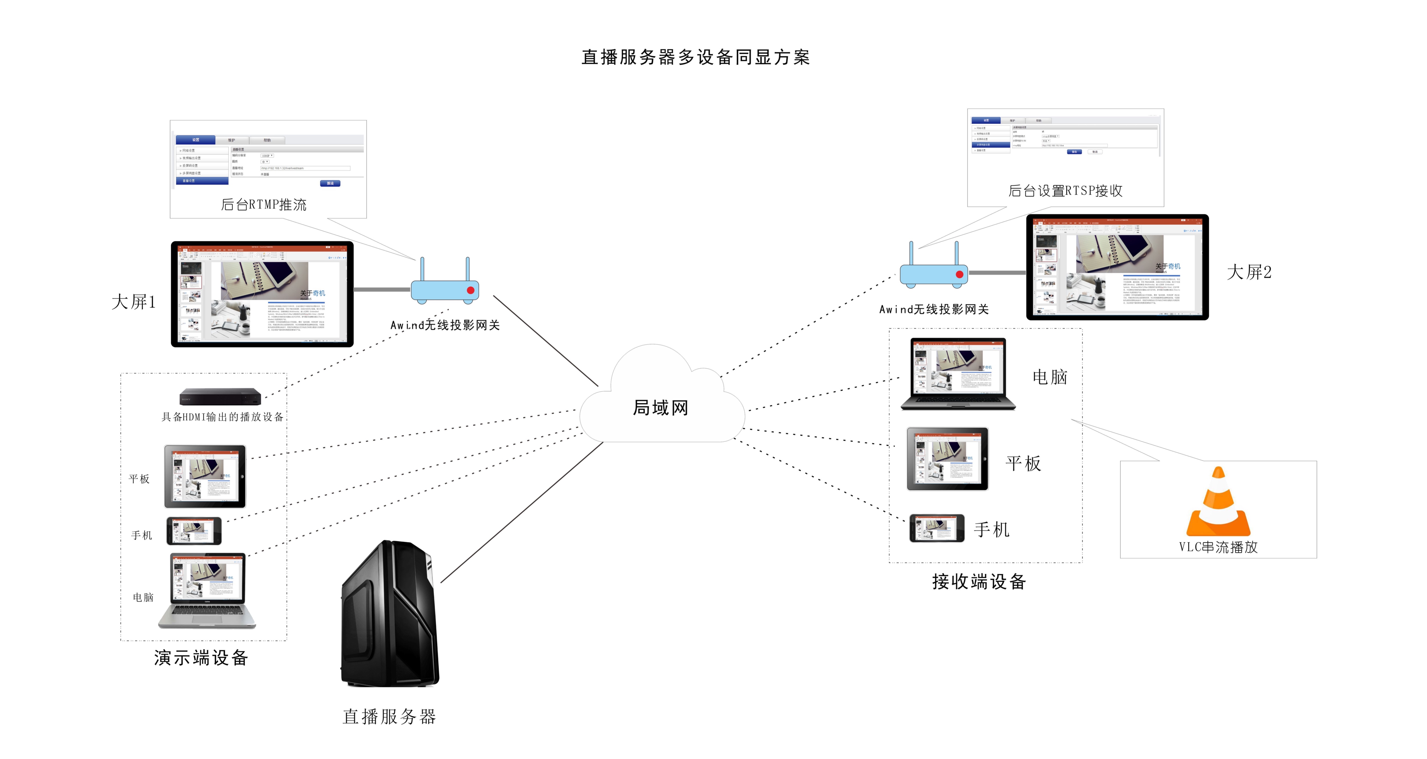 功能實現:該方案可實現演示大屏內容與局域網內各大屏和智能端設備(電腦,手機,平板)同顯,數量可達100。