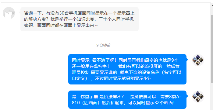 這是今天網友在知乎上的咨詢:“咨詢一下,有沒有30臺手機畫面同時顯示在一個顯示器上的解決方案?就是舉行一個知識比賽,三十個人同時手機答題,畫面同時都在畫面上顯示出來~”